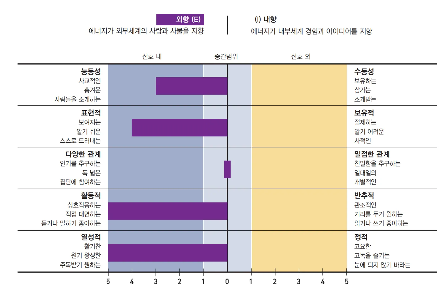 “E” 성향 대부분의 점수가 높은 확실한 외향인이지만 하위 척도 중