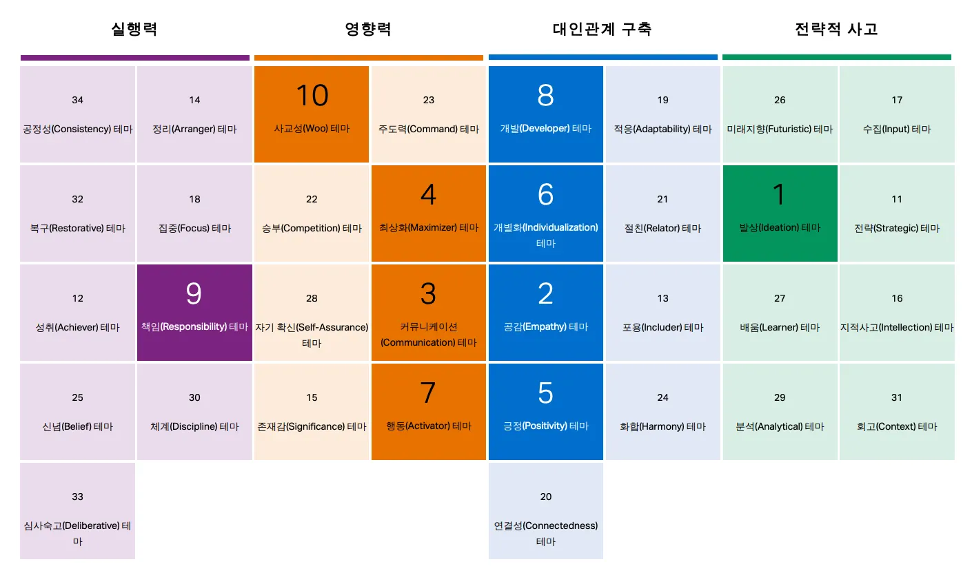 인터뷰를 진행했고 그 결과 인간의 재능을 4가지 영역으로 분류해, 각 영역 별 하위 테마 34가지로 구분했습니다.