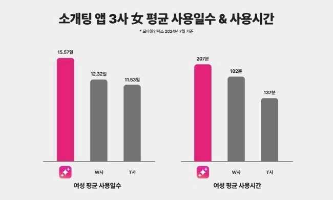 모바일인덱스 데이터 기준 여성의 월평균 사용 일수는 글램이 15.57일로 1위를 차지했다. 2위는 12.32일, 3위가 11.53일로 뒤를 이었다. 여성의 사용 시간 또한 ▲글램 207분 ▲2위 182분 ▲3위 137분 순이었다.