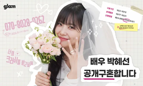 캠페인 콘텐츠 역시 몰입도를 극대화한 포맷으로 제작됐다. ‘연애하고 싶다’는 메시지를 담은 이색 티저 영상과 실제 ARS 전화 연결을 통해 확인할 수 있는 진짜 ‘속마음 인터뷰’에서는 박혜선의 솔직한 매력을 확인할 수 있다. 또한, 10월 2일부터 10월 12일까지 실제 앱 내에서 일반 유저가 박혜선에게 ‘크러쉬(글램의 메시지 기능)’를 보낼 수 있으며, 결혼 의사를 표시하는 ‘결혼 프로필 인증’ UI 등으로 유저 경험 전반을 캠페인과 긴밀히 연동시켰다. 공개구혼 모집이 마감되면 박혜선이 직접 선택한 유저와 매칭이 이뤄지며, 실제 데이트로까지 이어질 계획이다. 더 자세한 내용은 글램 공식 유튜브 채널 및 앱 내 캠페인 페이지에서 확인할 수 있다.